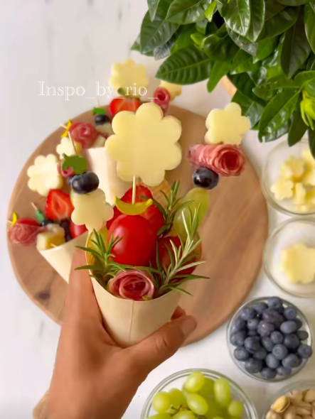 A quick and creative appetizer made with cocktail sticks, bamboo cones, and flower-shaped cheese. Perfect for parties, picnics, and special gatherings ✨