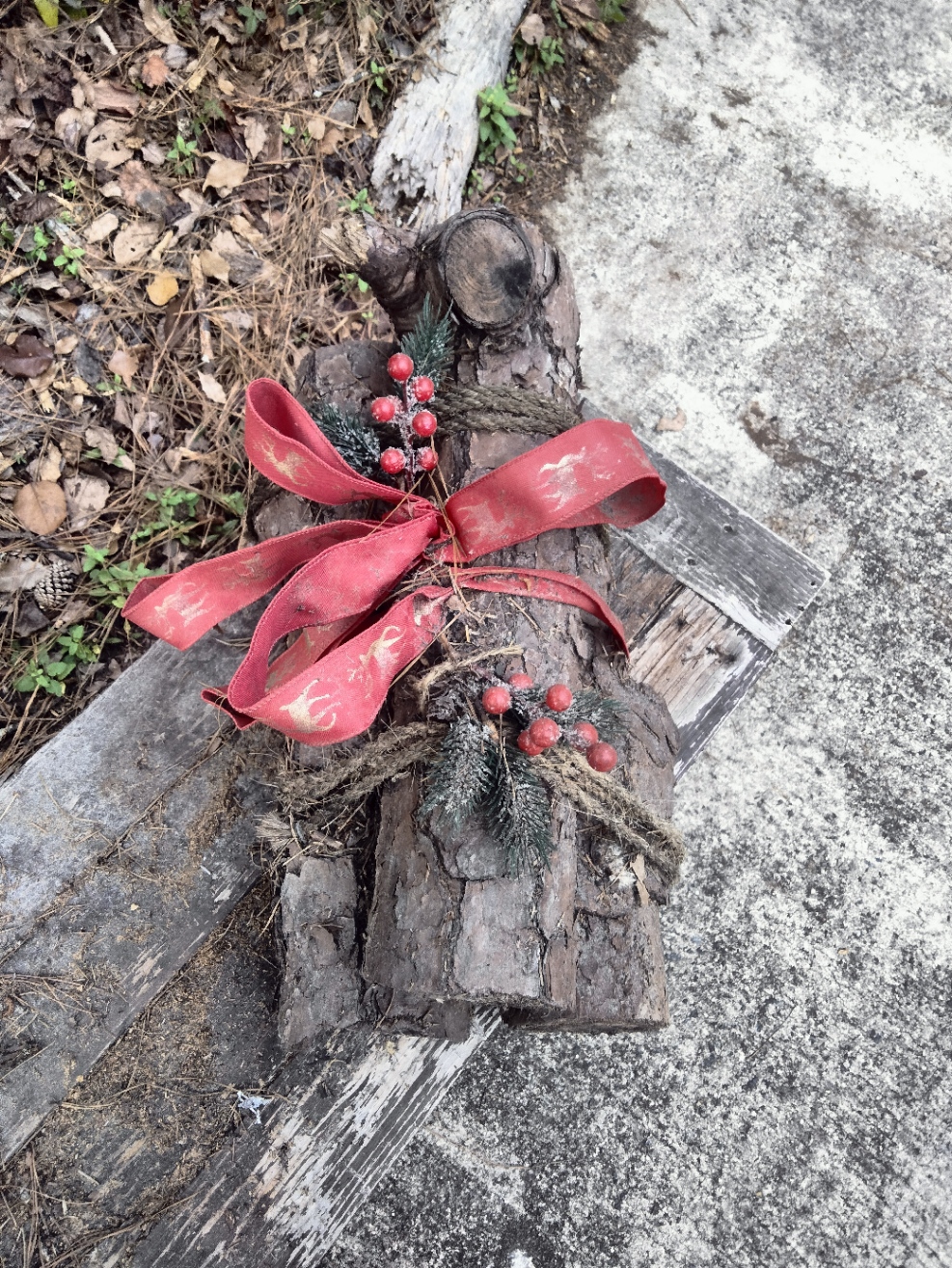 3 logs with red ribbon, holly berries, and a pine branch